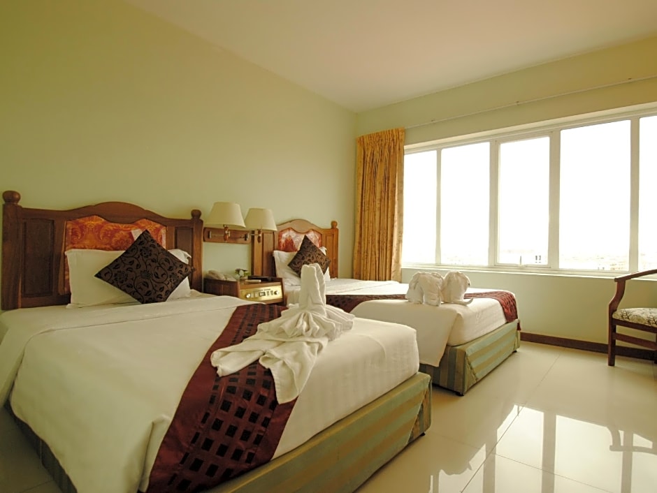 Room options range from Signature Queen and Queen rooms to larger suites. The Suite features a king bed and can accommodate multiple guests, while the Suite with Sofa Bed and Jetted Tub adds a sofa bed for flexibility. The Deluxe Suite offers two queen beds, and the Superior Queen pairing combines a sofa bed with two queen beds in a spacious 441-square-foot configuration. Additional choices include a King Room at 323 square feet and a Queen Room with two queen beds.